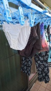 一番前に干されているのが、奥さんが穿いていたパンティーなんですね。レース付きのオシャレなパンティーですね。色は白ですか。確かにクロッチがだいぶ黄色くなっていますね。この色が奥さんの膣とオシッコの穴から出て来たヌルヌルしている汁と一日に何回もしているオシッコの色なのですね。洗濯しても落ちないほど染みが残るほど奥さんは、濃厚な汁と黄色いオシッコを出していることがよくわかりますよ。