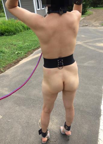 首輪にリードを装着して牝犬に…