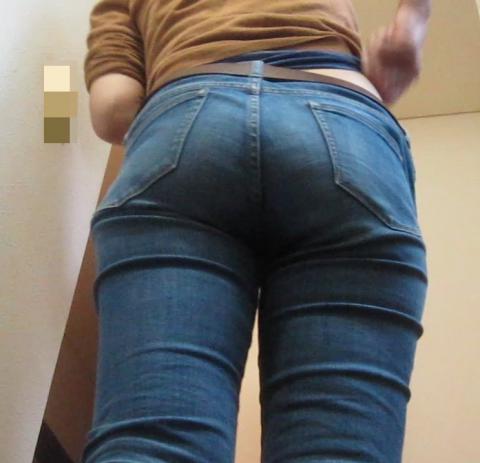 着衣尻画像です。パンツの横に渡る縫い目と尻の割れ目の縦線が交差するところが