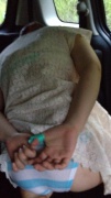 2日目、単独さんの車の中で指をソフトに縛られノーブラ、目隠し、遠隔ローターを下着の中に忍ばせてます。